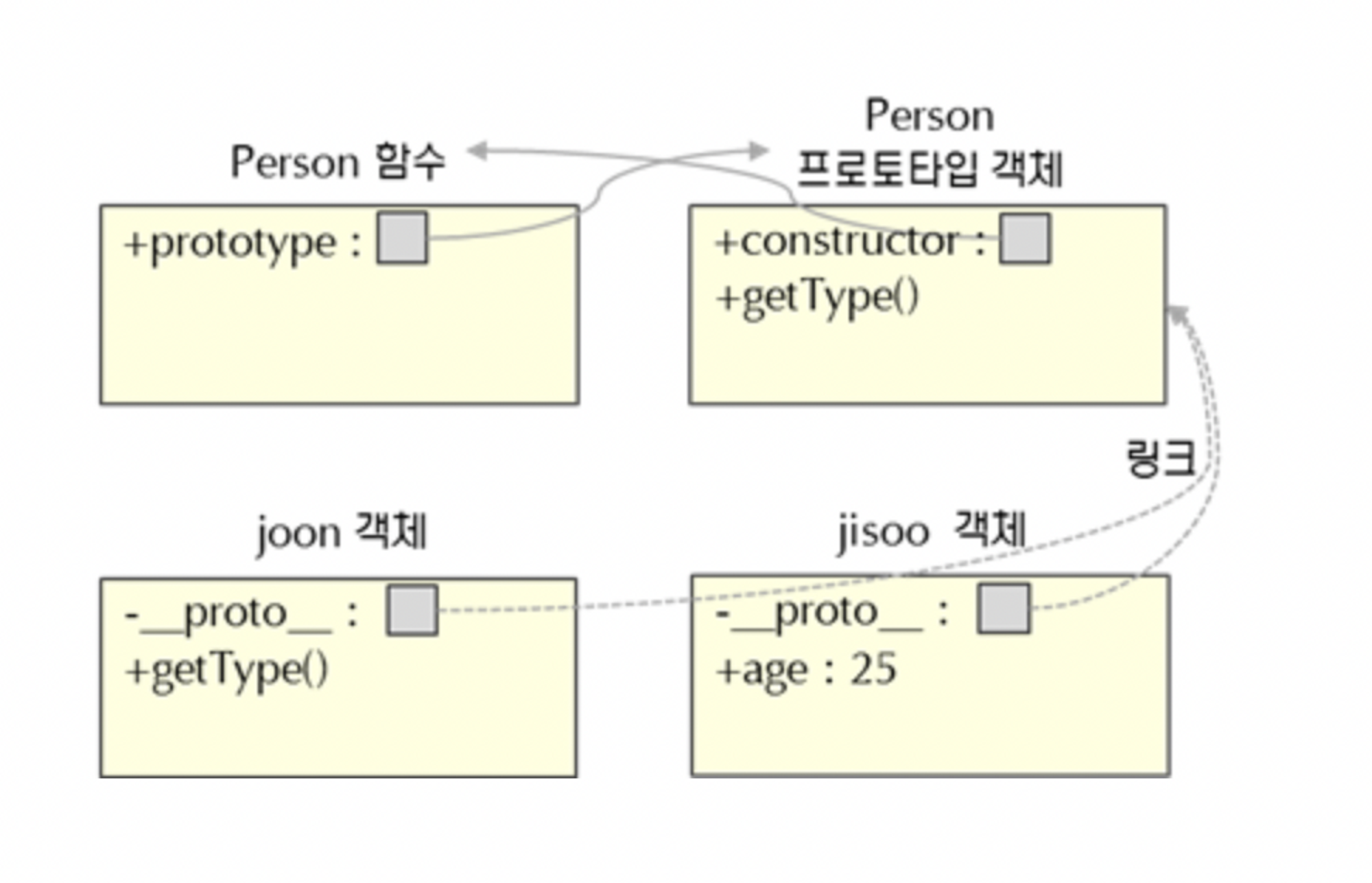 - 프로토타입 객체에는 그 클래스의 속성과 메소드들이 담겨있다. (주로 메소드들이 담겨있다). 프로토타입에 들어가 있는 메소드들은 클래스로부터 생성된 인스턴스들이 사용할 수 있다. 즉 자식 객체와 메소드를 공유할 수 있다.